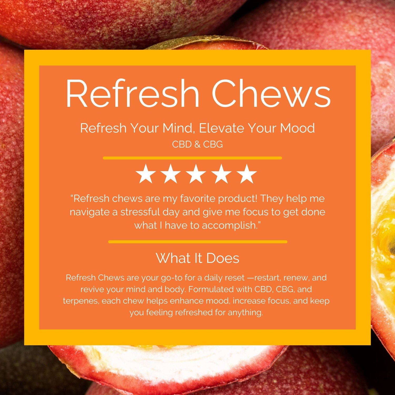 Revitalize your mind and uplift your day with Refresh Chews! Formulated with CBD, CBG, and terpenes, each chew helps enhance mood, increase focus, and keep you feeling refreshed for anything.