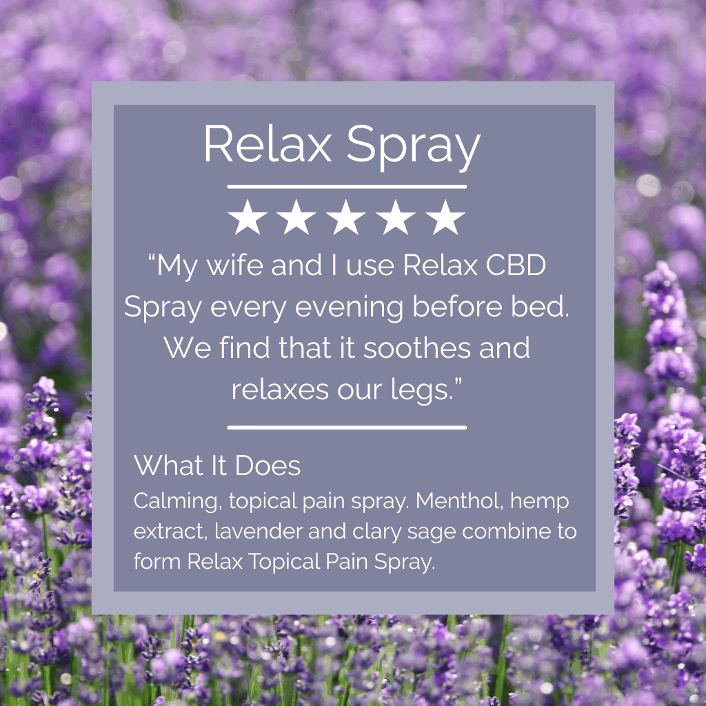Relax Pain Spray is the perfect combination of CBD, menthol, clary sage and lavender.