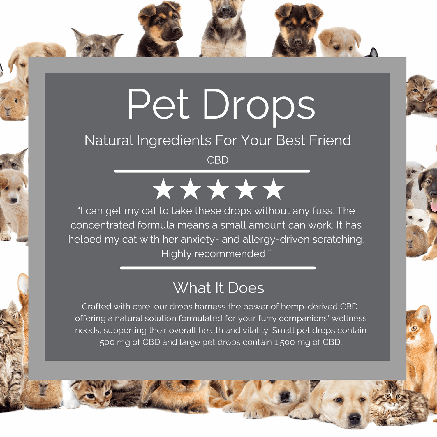 What it does: Formulated with care, our pet drops harness the power of hemp-derived CBD, offering a natural solution for your furry companions' wellness needs, supporting their overall health and vitality.